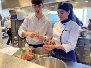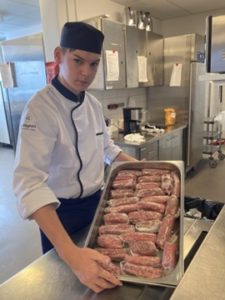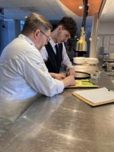 Kun keittiö pääsi kunnolla vauhtiin, “Yes, chef!” raikasi, tuoksu oli huumaava ja ruokaa kiidätettiin saliin tiuhaa tahtia. Keittiön pyörittäminen ei todellakaan näytä helpolta: sen välissä, kun asiakas tilaa ja saa ruokansa on monta välivaihetta, ja kun asiakkaita on yli kaksikymmentä, köysiä mistä pidellä piisaa. Opettaja Pasi piti pakkaa kasassa ja toimi tarjoilijoiden ja keittiön välisenä viestinviejänä. Välillä kielenkäyttö keittiössä voi ulkopuolisen korvaan kuulostaa tylyltä, mutta keittiössä on oltava tehokas.