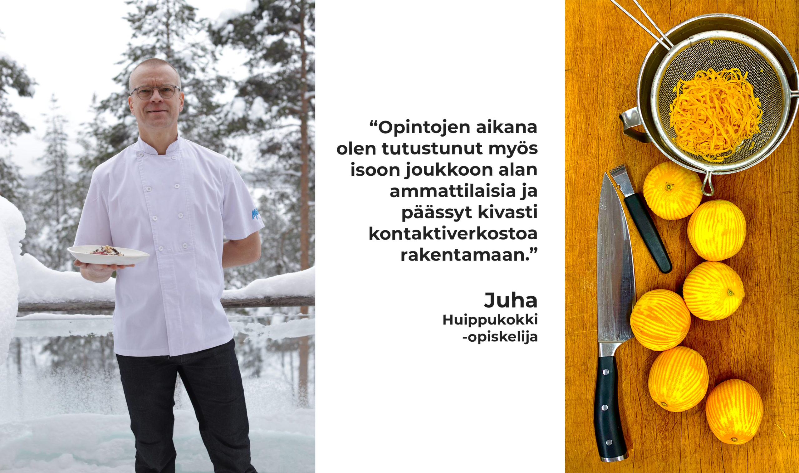 ”Eniten olen pitänyt mahdollisuudesta päästä suoraan ’oikeisiin töihin’ hyvien ja arvostettujen ravintoloiden keittiöihin. Myös ravintoloiden työntekijöiden mahtava suhtautuminen meihin opiskelijoihin sekä hyvä asenne ovat tehneet vaikutuksen. Opintojen aikana olen tutustunut myös isoon joukkoon alan ammattilaisia ja päässyt kivasti kontaktiverkostoa rakentamaan”, Juha jatkaa.