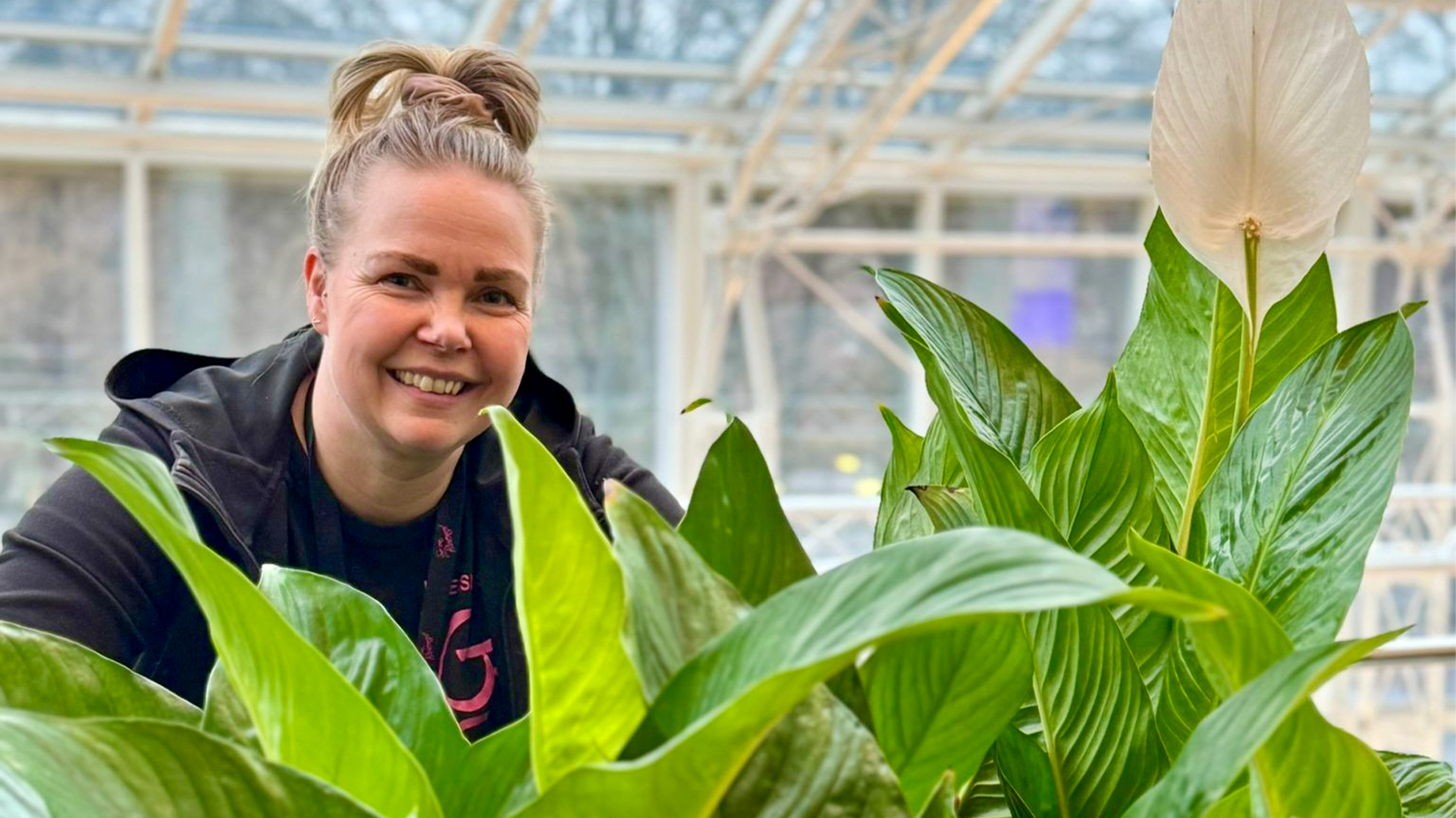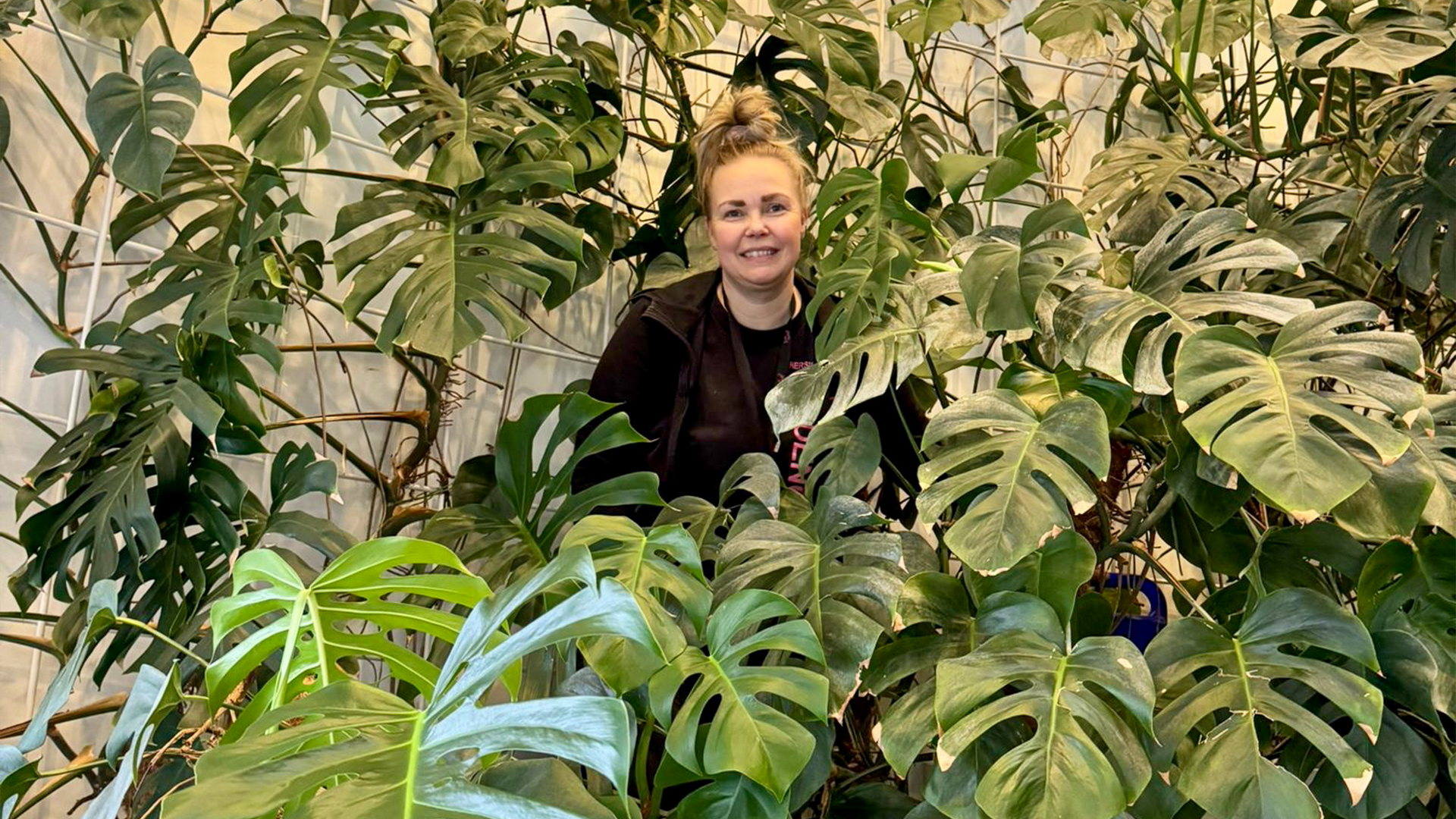 Noora pyyhkii anopinkielten lehtiä ja kertoo aloittaneensa puutarhurin opintonsa AhlmanEdulla vuonna 2020. Hän oli ollut aikaisemmin töissä sisustustavaramyymälässä ja autoliikkeessä, joten asiakaspalvelutyö oli hänelle jo ennestään tuttua. Kouluaikana mielenkiintoisinta olivat erilaiset käytännön projektit ja oikeat asiakastyöt. ”Oli todella hienoa päästä esimerkiksi tekemään kukka-asetelmia Tampereen Raatihuoneen tilaisuuksiin ja Tampere-talolle. Välillä meinasi mennä sormi suuhun, mutta onneksi opettajat auttoivat ja tsemppasivat” hän kertoo.