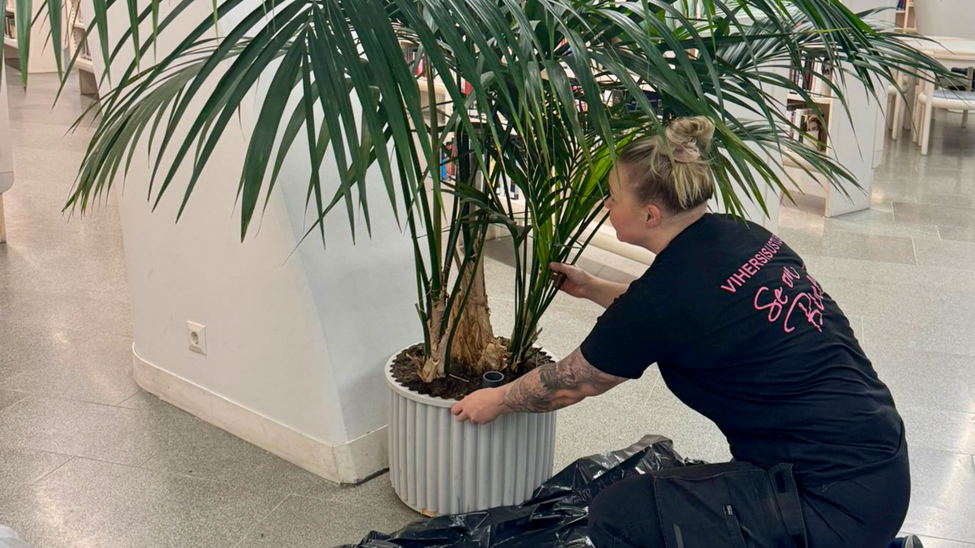 Viherkasvihuoltajan täytyy liikkua niin kuin hän ei paikalla olisikaan. ”Käymme muun muassa erilaisissa toimistoissa, joten emme halua aiheuttaa asiakkaille häiriötä.”