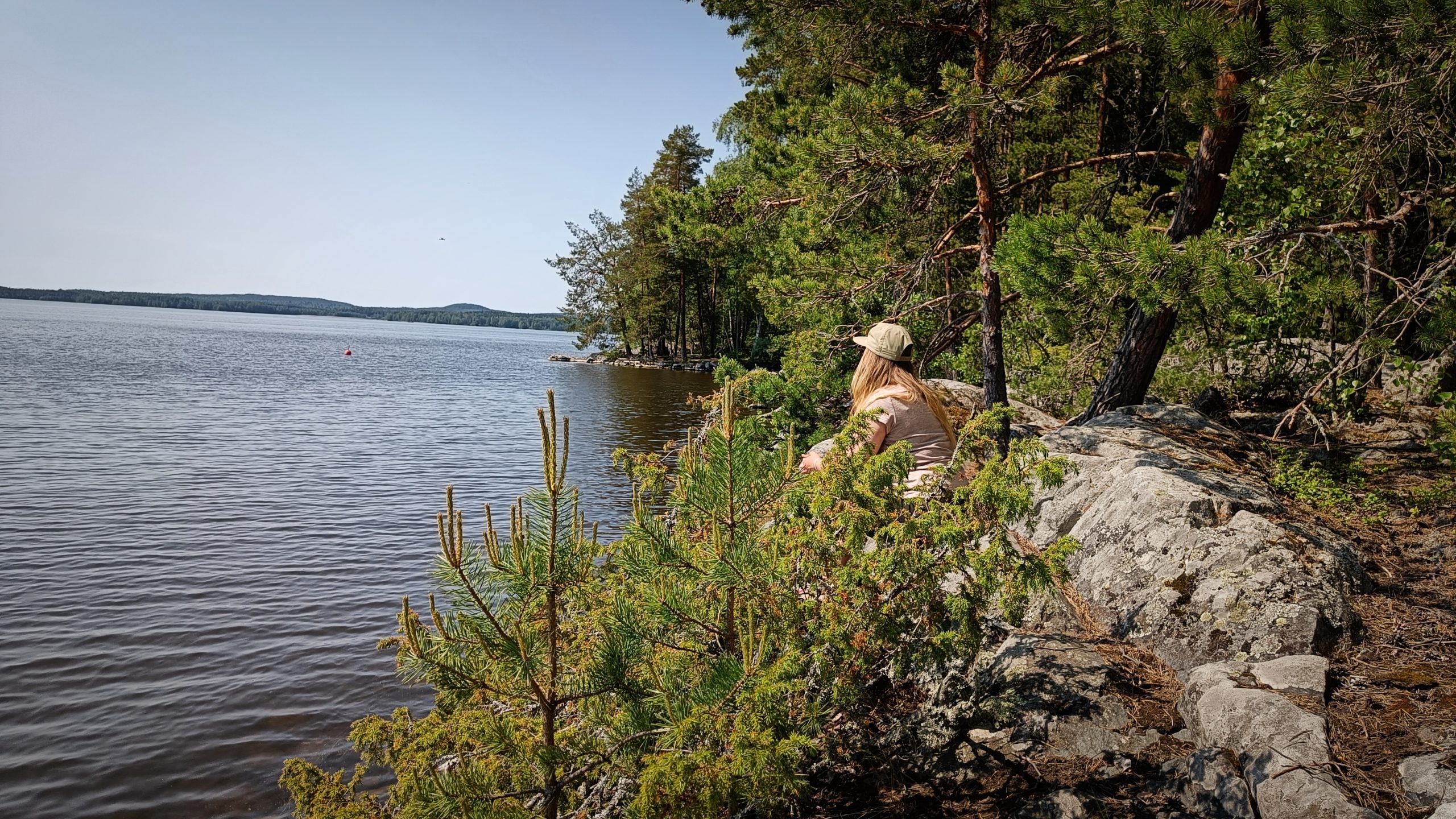 Jatkoimme kulkuamme pitkin reittiä, jonka kivinen ja kantoinen pohja piti huolta etenemisen rauhallisesta tahdista. Nyt ei ollut kiire mihinkään. Järven kesäinen tuoksu pyörähteli silloin tällöin metsän puolelle. Hiljaisuuden huminan rikkoi vain puissa kaikuva käpytikan nakutus.