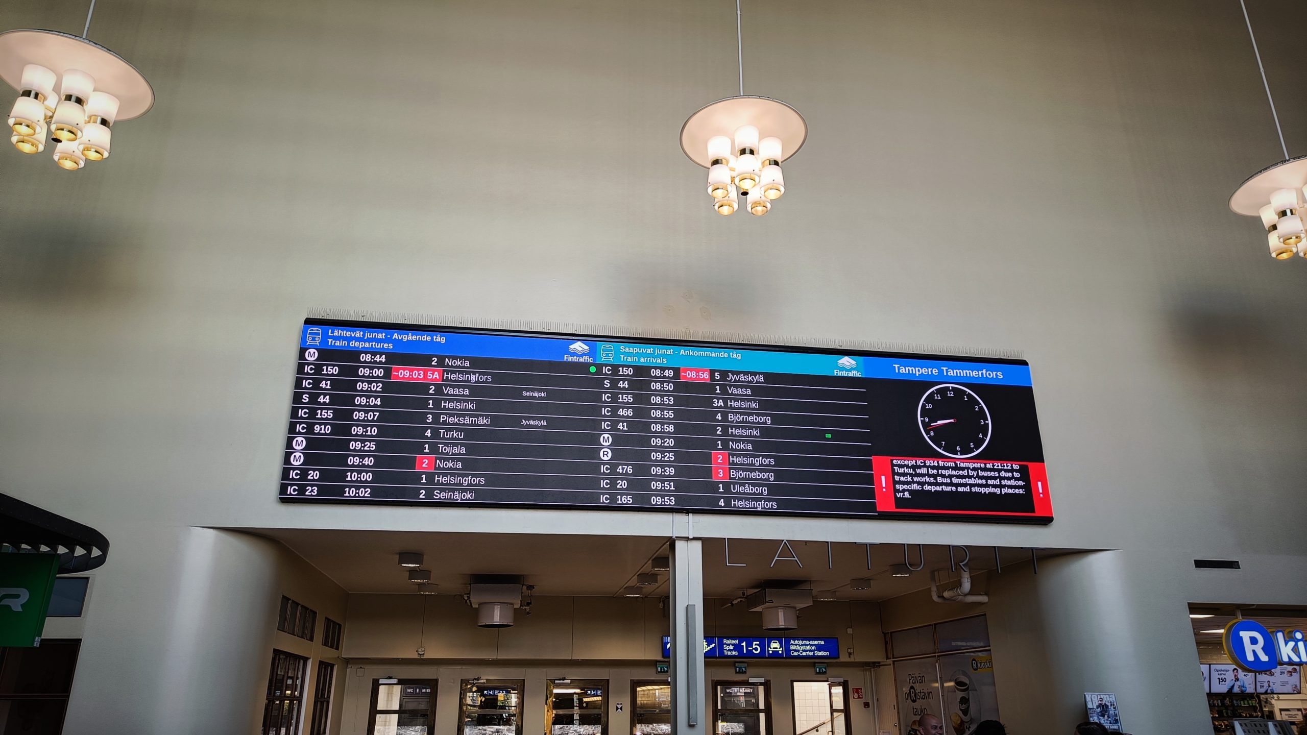 Rautatieasema kuhisi ihmisiä. Työ- ja lomamatkalaisia viipelsi edestakaisin, joten astuin suosiolla heti hallin sivustalle tutkailemaan seinällä komeilevaa junien aikataulua. Junamme lähti laiturilta 3, josta pienen harhailun jälkeen löysinkin muut retkelle lähteneet koulutoverini. Juna saapui ajoissa vähän yhdeksän jälkeen ja pääsimme etsimään istumapaikkojamme. Kanssamatkustajilla oli aluksi hieman epäselvyyksiä vaunujen numeroista, mutta lopulta pääsimme yhteisymmärrykseen ja kaikki löysivät omat penkkinsä. Minä istahdin käytäväpaikalle vitosvaunussa, sillä ikkunapaikat olivat menneet nopeimpiin suihin.
