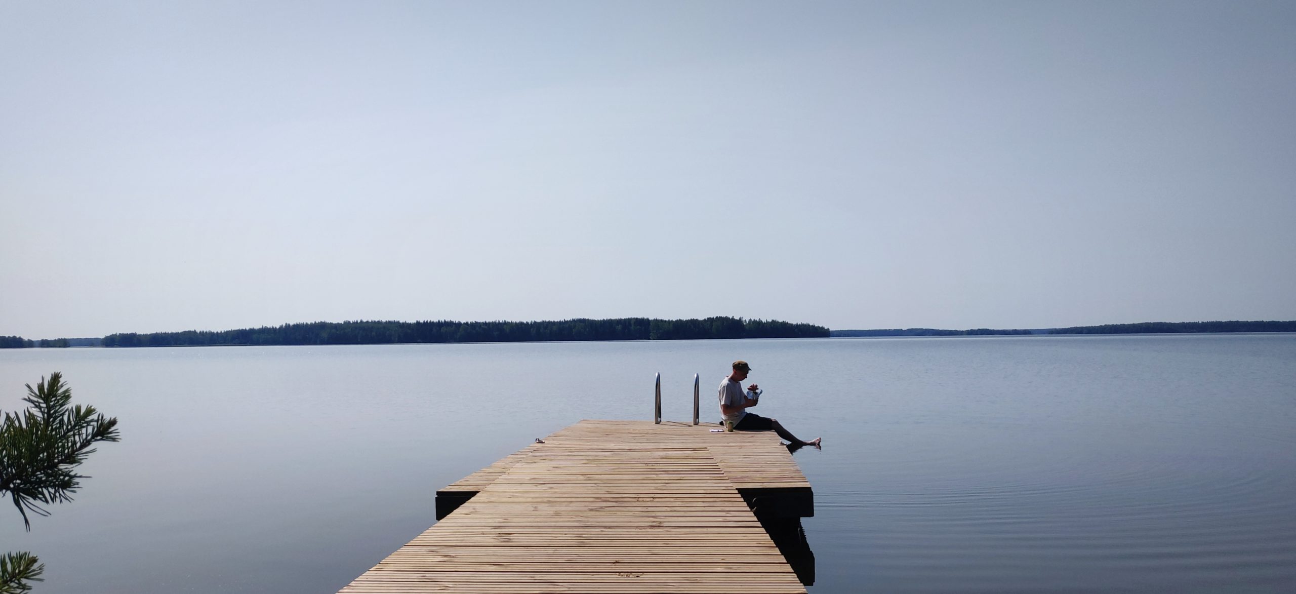 Saavuimme reitin seuraavalle laavupaikalle, jossa päätimme pitää evästauon. Ylempänä laavun vieressä oli toisten retkeilijöiden telttoja kasattuna, alueella on myös sallittua yöpyä. Me löysimme rannasta pöydän ja penkit, sekä upean uimalaiturin, johon oli mahdollista saapua myös veneellä. Minä ampaisin heti istuskelemaan laiturille ja kaivoin repustani aamulla kasaamani kanatortillan. Tortillan välissä oli myös fetakastiketta, kevätsipulia, avokadoa, jäävuorisalaattia ja tietenkin kotimaisia mansikoita. Riisuin kengät ja sukat ja pulautin jalkani vilvoittavaan veteen. Siinä istuimme ystävän kanssa järvelle katsellen, eväitä nauttien ja niitä näitä jutellen. Ei elo paljoa auvoisemmaksi voisi muuttua.