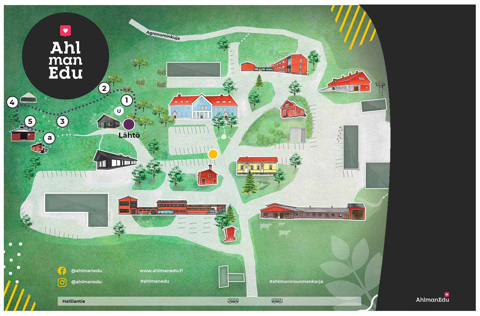 Karttaan on merkitty keltaisella pallolla kampuksen aluekartta, jonka vierestä löytyy opaste seikkailupoluille. Kävele siis aluekartalta vasemmalle päin, kohti mustaa hirsirakennusta. Sen vieressä on kasvihuone ja seikkailupolun alku. Polku lähtee kampuksen kasvihuoneen nurkalta (kartassa U-rakennus), penkkiviljelmän ja syötävän metsäpuutarhan alueella kiertäen.